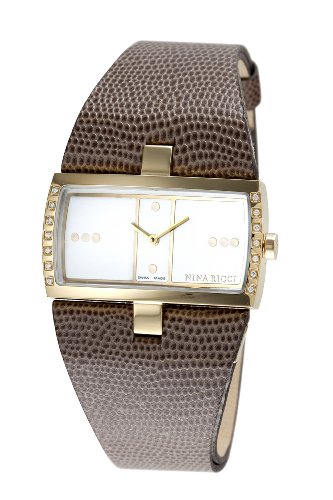 The Nina Ricci Women's N027 Quartz Watch makes a statement in smooth style. This impeccable timepiece features a comfortable brown, textured leather band secured with a deployment clasp. A gold-tone stainless steel case and smooth gold-tone stainless steel bezel, featuring diamonds on each side, attract attention to the unique dial. The silver dial features a distinctive design and gold-tone indexes at the 12, 3, 6, and 9 o'clock positions. The dial is protected by a mineral crystal. This timepiece features quartz movement and is water resistant to 99 feet (30 meters).