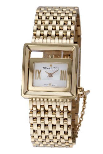 A unique case and bezel design, paired with an eye-catching, gold-tone bracelet, gives the Nina Ricci Women's N022 Quartz Watch a contemporary feel with ageless appeal. The rectangular, gold-tone stainless steel case and bezel encase a smaller rectangular bezel and crown for a unique framing effect. Oversized Roman numerals mark three and nine o'clock, standing out boldly against the white dial. Slender, dual gold-tone hands keep the time, while the Nina Ricci logo sits just above center. A high-quality sapphire crystal protects the dial. The striking gold-tone stainless steel bracelet features a gorgeous woven design and fastens with a deployment clasp. Quartz movement and water resistance to 99 feet (30 meters) round out this timepiece's exquisite craftsmanship.